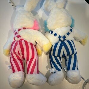ADORABLE EASTER BUNNY DUO IN COORDINATING OUTFITS. ONE BUNNY IN BLUE & WHITE STRIPEX & ONE BUNNY IN PINK & WHITE STRIPED OUTFIT. KEPT IN STORAGE. NEW WITHOUT TAGS. PERFECT GIFT OR DECORATION. PET FREE AND SMOKE FREE HOME.