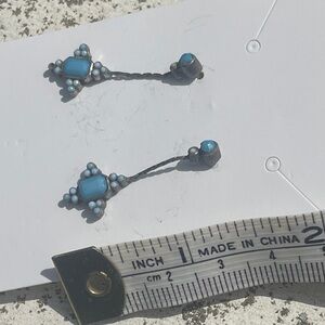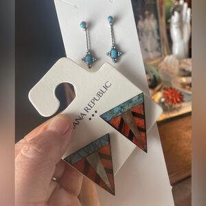 Boho Vintage geometric earrings featuring turquoise and mother of pearl. The dangle pair is stamped silver, missing a tiny stone