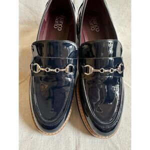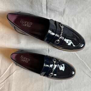Franco Sarto Collette faux leather vegan dark navy blue loafer with padded insole. Beautiful metal clasp details and 1.3 inch lug sole. New without box. No scuffs or imperfections, mint condition!