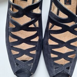 Pre-owned 1940s style black suede sandals. Next- Made in Spain. Marked Europen size 41 M. I am a US 8, 8.5 and they fit really well. Excellent pre-owned condition. Some marks in the heels, please see pictures. Measurements in inches approx. heel 3, length of the 👞 11. Smoke and pet-free environment.