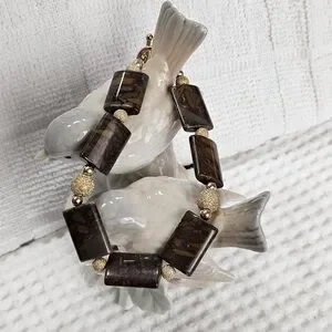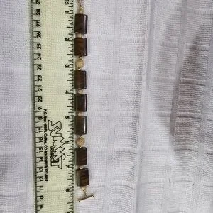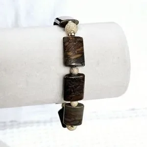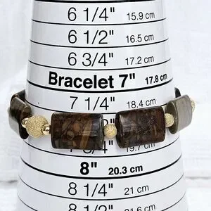 This elegant vintage bracelet features rich brown jasper gemstone beads complemented by shimmering 14K Gold Plated shimmer accent beads and toggle clasp. The jasper beads are a beautiful curved lozenge-style shape. The round golden beads have a texture that provides lots of visual interest as well. This luxurious vintage piece is marked 1/20 14K on the toggle bar and is considered to be in Good Used Condition. Its fit in my bracelet fit mandrel shows that it will best fit up to a 7.5” wrist. Please see all pictures for details, condition, and size comps.
