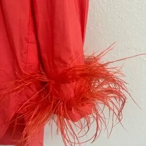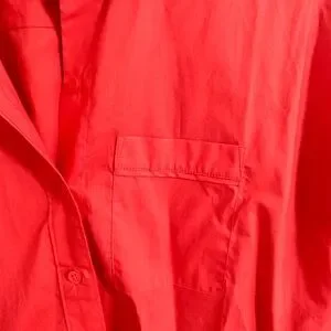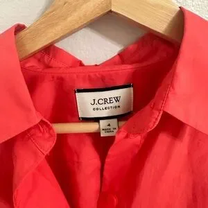 This insane J. Crew Collections feather button down is a stunning shade of coral. Featuring a breast pocket with same color stitching, buttons, and feathers, this shirt IS your outfit. Jeans, mini skirt, who cares- all eyes are on this. It has buttons at the sleeve as well in case you want to roll it up, and a scoop hem which comes up at a flattering angle. It is meant to be slightly oversized but I’ve worn it tucked into jeans and it looks great. The back also has a flattering pleat detail! Size 4