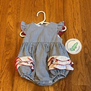 Adorable baby girl bubble in a classic blue and white gingham pattern with red accents on ruffles. Southern Smocked Company size 9 months I also have a matching sister outfit in size 3T. New with Tags Absolutely Precious!!