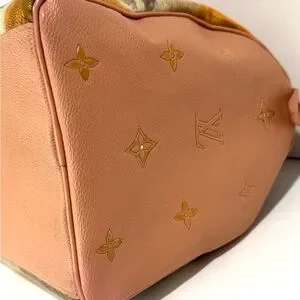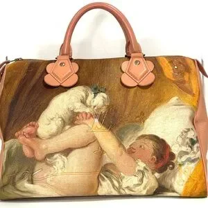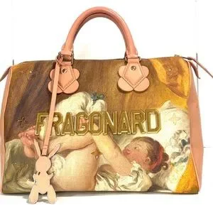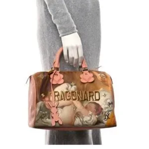 This is an authentic LOUIS VUITTON Masters Fragonard Speedy 30. This chic tote is made of a rendition of a fragonard painting on coated canvas. The handbag features pink calfskin leather trim and side panels, rolled leather handles, gold Monogram serti flower shapes and bold gold reflective metallic letters that spell Fragonard, and pink hardware. The wide top is open to a pink leather interior printed and filled with gold that tells you more about this exciting collaboration.