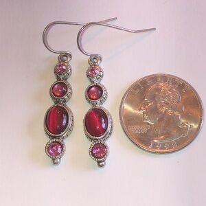 Stylish dangle earrings featuring vibrant pink cat eye stones & CZ rhinestones. Perfect for adding a pop of color to any outfit.