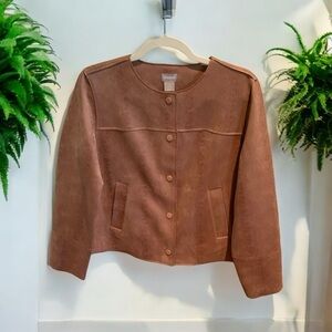 Elevate your wardrobe with this stylish Chico's Women's Ultra Suede Jacket in Blush Pink. This jacket features a classic fit, long sleeves, and a snap closure. Measures 22” in length x 19” across chest x 23” sleeve length and 16” across shoulders. The soft, lightweight and packable design makes it perfect for any season when you want to add a jacket to your outfit. Excellent new condition; never worn.