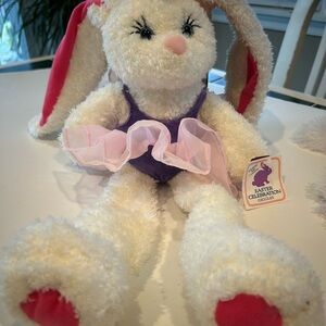 ADORABLE PLUSH FLOPPY BUNNY DUO. ONE BUNNY HAS A COLORFUL POLKA DOT BOW AROUND THE NECK AND LONG FLOPPY EARS AND LEGS. THE OTHER BUNNY HAS AN ADORABLE PURPLE TUTU OUTFIT WITH PINK EARS. PERFECT GIFT OR DECORATION. KEPT IN STORAGE. ONE HAS TAGS. SMOKE FREE AND PET FREE HOME. MEASUREMENTS IN PICS.
