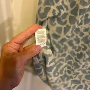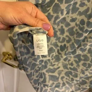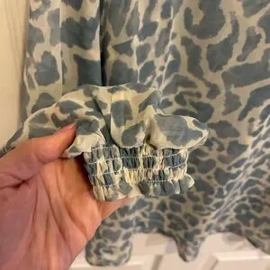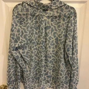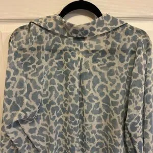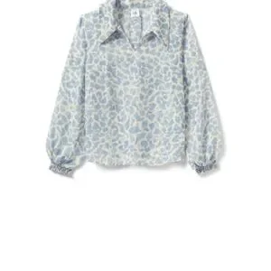 The Pounce Blouse comes in a baby blue and white skin print that reads as clouds, a heavenly addition to your spring wardrobe. It comes in a sheer chiffon fabric with an oversized collar and a V-neckline. Don't wait, jump on this must-have.