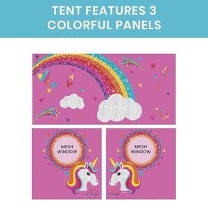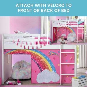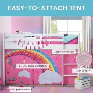 Brand new Jojo Siwa Loft Bed Tent still in packaging, never opened. Dimensions and info is on the photos. This is not a bunk bed. This is just a tent for a loft bunk bed. Multiple tents are available. Color is mostly pink along with multiple other pretty colors.