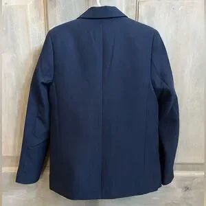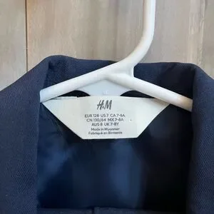 Boys Size 7/8. Stylish navy blazer with a sleek design. Three button vest and navy pants. Perfect for formal occasions. Worn once for a wedding. In excellent condition. Comes from smoke free home.