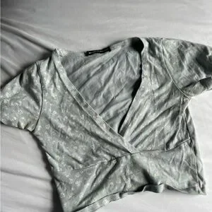 Chic floral wrap top in a soft light blue shade. Perfect for casual outings.