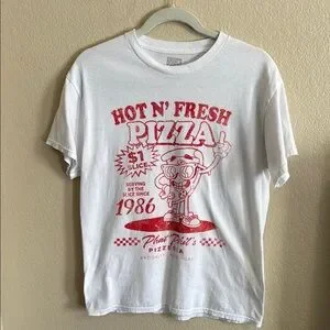 White t-shirt featuring a red pizza graphic and text design.