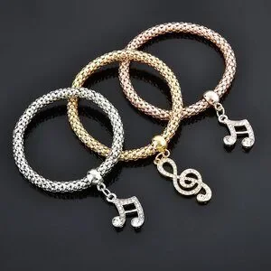Set Includes: 3 stretch bracelets with musical note charms (treble clef, double note, and single note)
