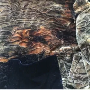 Vintage Shirt with a Velvet Feel & textured pattern. Button Down style, Says size Large but could fit XL also. 90% polyester/ 10% spandex for stretch. Bust approx 23.75” across, sleeves approx 21.25” from shoulder, length approx 30” from top back neck seam.