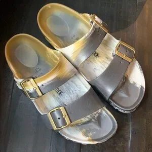 Artistic Birkenstock slide sandals with a blend of gray and tan. Worn a few times. Features adjustable straps for a perfect fit. Size 39 or US 8 made in Germany. See video!