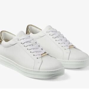 Jimmy Choo Rome/F White Calf Leather and Champagne Metallic Trainers Sneakers 37