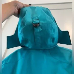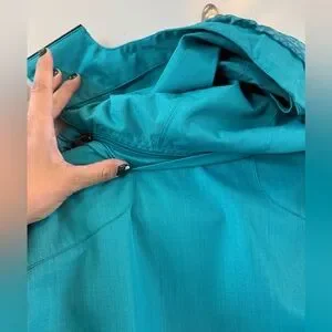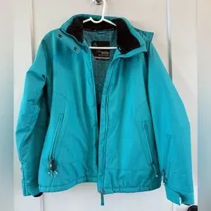Stylish teal hooded jacket with zip closure and multiple interior and exterior pockets. Perfect for cool/cold weather!