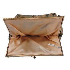 This is an antique Aubusson tapestry purse from France, featuring a courting couple design. The purse has a kisslock closure and is made of tapestry material with a lovely pink satin lining. It has a distinctly Victorian style and is a handmade original piece from the early 1900s.