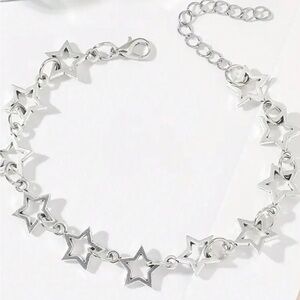 This elegant silver bracelet features a series of open star shapes connected by small links, creating a fluid and flexible design. The bracelet is secured with a lobster claw clasp and includes an extender chain for adjustable fit. Its lustrous silver finish adds a touch of sophistication to any ensemble.