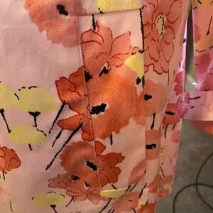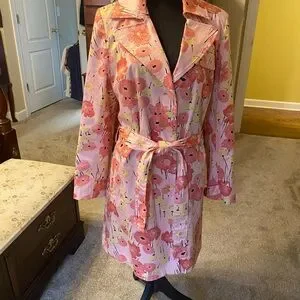 Stylish pink trench coat with a vibrant floral pattern. Features a belted waist and wide lapels.Fully lined. Excellent condition.
