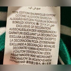 This vibrant green striped shirt features playful horse appliques in various colors. Perfect for adding a fun touch to your child's wardrobe.