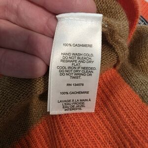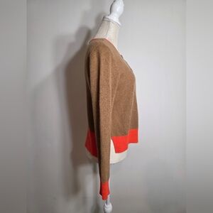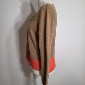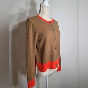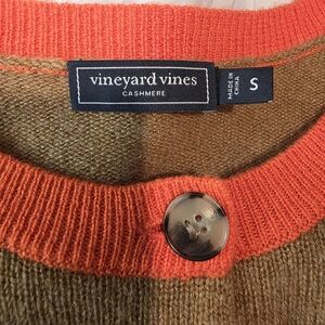 Excellent gently used condition, 100% cashmere button up cardigan from Vineyard Vines. Women's size Small. Beautiful camel color with slight natural heathering with orange-rust trim. Buttons are tortoise colored, and create a classy contrast. Timeless, classic piece in 100% cashmere with a modern color twist. Perfect for any season and can be worn open or buttoned. Slight hi-low hemline with notched waist hem.