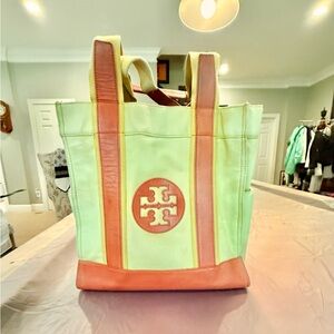 Tory Burch Large Lime Green Canvas Brown Leather Tote Bag MSRP $358