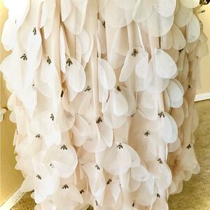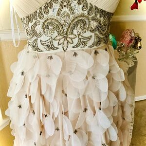 This stunning cream gown by Sue Wong features a ruched bodice with a V-neckline, perfect for a bride or wedding guest. The dress is beautifully embellished with intricate detailing, adding a touch of elegance to any special occasion. Pit to pit 14 inches length 24.5 inches from back to them.Polyester and silk spot clean.