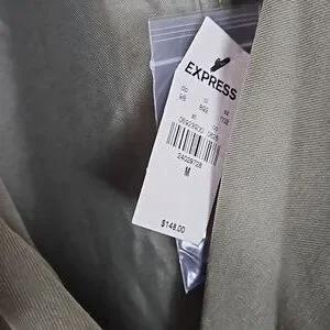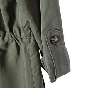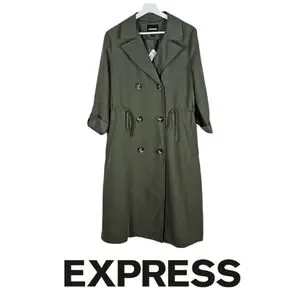 NWT Express soft olive green trench coat with adjustable waist, two front pockets, and adjustable sleeves