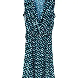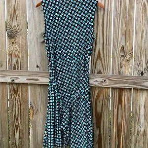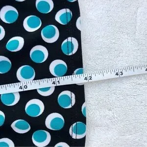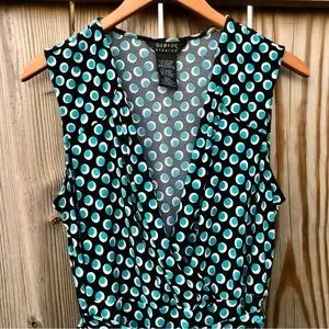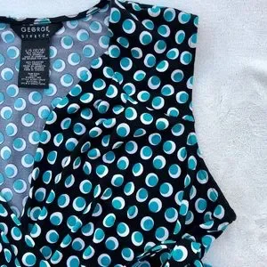 George faux wrap dress in black with white and teal polka dots. Belted, 100% polyester, chest measures 18 inches waist-16 inches length-42 inches, v-neck, three pleats around neckline and sleeveless.