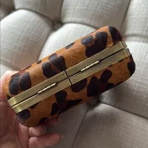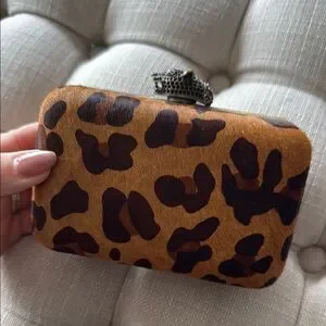 Stylish leopard print clutch perfect for any occasion. Features a unique animal clasp for added flair.