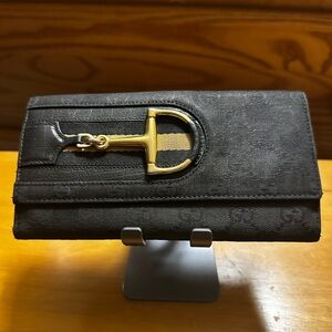 Gucci Black Canvas & Leather Wallet with Gold Horsebit Accent. EUC. Elegant black wallet featuring a striking gold accent. Slight rubbing on the horse it detail. Perfect for any occasion.