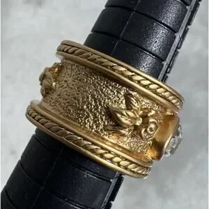 Vintage Elizabeth Taylor gold tone hearts rhinestone roses ring. Size 5. Band width measures 1/2 inches. Very well made statement piece. Photos show all sides of ring. Signed inside but hard to get the camera to focus. Some minor signs of use. Overall very well cared for. No noticeable flaws. (#197A)