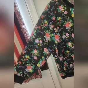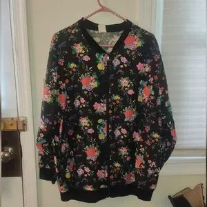 Stylish bomber jacket with vibrant floral patterns on a black background. Perfect for adding a pop of color to any outfit. Geandmacore, vintage, very lightweight and cute.