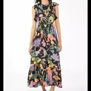 Banjanan Hannah Dress Large Eden Garden Black Print Viscose Maxi $400 Retail