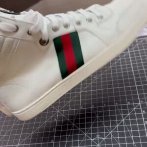 These high-top sneakers feature a sleek white design with green accents, crafted from a textured leather material. The traditional lacing system and distinctive side stripes add a touch of style to these versatile shoes. Perfect for casual outings, they offer both comfort and a modern look.