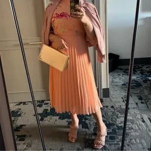 Elegant peach pleated midi dress featuring floral embroidery. Perfect for special occasions.