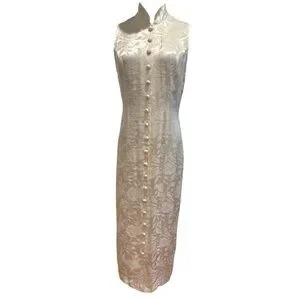 Elegant and timeless, this 1970s Knapp Studio vintage cream satin brocade dress channels a stunning Asian-inspired silhouette. Crafted from a luminous floral brocade fabric, this sleeveless long midi dress features a full button-down front, offering both structure and sophistication. The adjustable back waist tie allows for a more customized and flattering fit, accentuating the waist in a subtly fitted, feminine silhouette.
