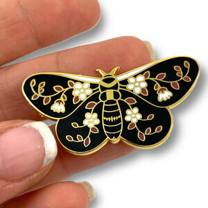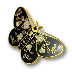 Beautiful large gold enamel daisy sacred moth pin. Shimmering gold outline with white and red daisy flowers over black wings. Measures 1.50" x 1 7/8".