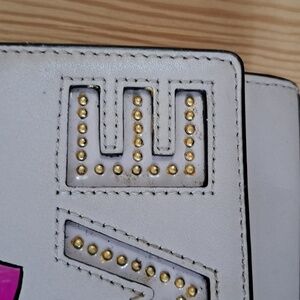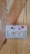 Cute little light pink crossbody has Love embellished on it with gold metal dots. I've embellished it with red, blue, and pink hearts. The back has a cute little blue character on it that we all know and love! Bag is from a well known designer and has been upcycled with my hand painting.