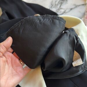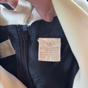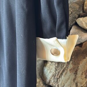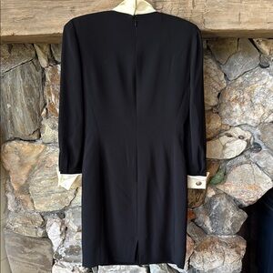 This sophisticated VTG sheath dress by Dana Buchman features a striking black and white color scheme, perfect for work or cocktail occasions. The long sleeves are elegantly cuffed, complementing the notched collar and French cuffs for a polished look. Its fitted silhouette ensures a flattering fit, making it a versatile addition to any wardrobe. The dress has removable shoulder pads.