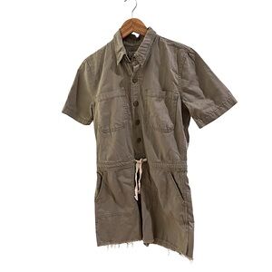 Stylish khaki dress with short sleeves and button-up front. Features drawstring waist , front and back pockets. Raw hem