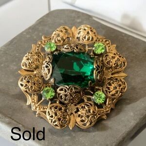 Add a touch of vintage elegance to your outfit with this stunning brass filigree brooch pin with prong set rhinestones. The center is adorned with a large emerald green, oval rhinestone surrounded by four smaller rose cut, lime green rhinestones. The intricate and ornate design of this piece is a testament to the craftsmanship of retro Germany, making it a perfect addition to any jewelry collection. Whether you're dressing up for a special occasion or adding a touch of glamour to your everyday look, this brooch is sure to impress. This gorgeous piece measures 2” in diameter and is in overall very good condition with minor wear consistent with age. Please review all photos as they are part of the description. This brooch will arrive in the red organza pouch as pictured which is perfect to give as a gift to the vintage jewelry collector, or simply as a treat for yourself.