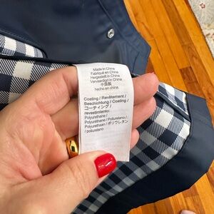 J. Crew. Excellent condition vinyl rain jacket. As waterproof as it gets. Classic navy blue. Perfect for petites.