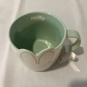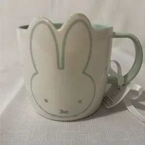 The Miffy by Magenta Mug in green & white is a large 18 oz ceramic and porcelain mug designed with a round shape and an etched Miffy face pattern. This contemporary style mug is perfect for hot or cold beverages, suitable for all occasions including birthdays, Mother's Day, and summer. Dishwasher safe and made in China, this original Miffy themed mug is a great addition to any collection or a perfect gift for teens, boys, girls, and adults alike.