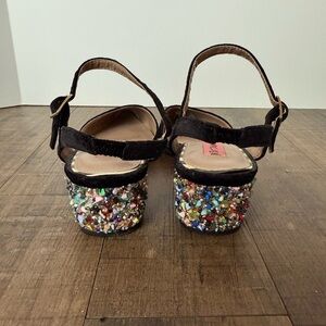 These elegant black heels by Betsey Johnson are so much fun featuring a pointed-toe design and a comfortable low block heel. The ankle strap with a small buckle ensures a secure fit, while the heel area is adorned with sparkling multicolored stones that add texture and color to this elegant silhouette.