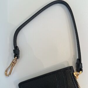 Sleek black card holder with gold accents. Features multiple card slots and a key ring.
