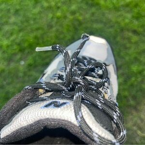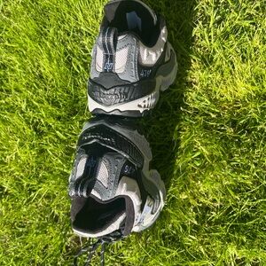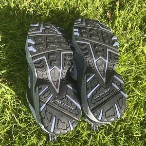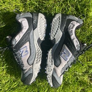 New Balance W476GP All Terrain women's shoes. Good used condition. All Terrain, suitable for hiking and running. Some wear on shoes/missing shoe lace tip. Color: Black and gray. Features durable designed for off-road use with breathable mesh and aggressive outsoles.