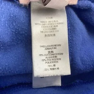 Approx 16” across waist, 9.5” rise, 33” inseam, 11” leg opening. Pull-on, tie at waist, bright blue with pink logo on front left side. Good preowned condition.