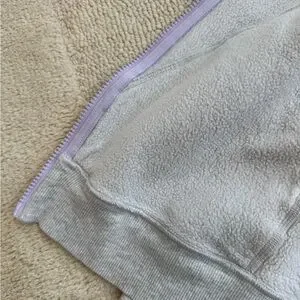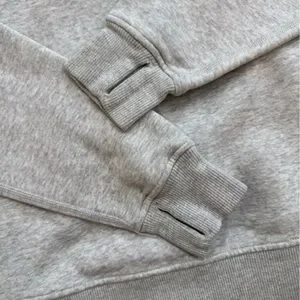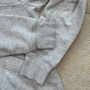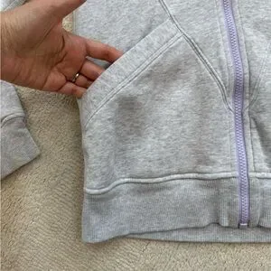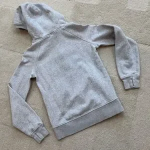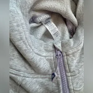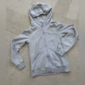 This Ivivva hoodie features a soft, heathered gray fabric with a full-length zipper, offering a comfortable and versatile style. Ideal for casual wear or layering in cooler weather, its neutral color makes it easy to pair with various outfits. Lululemon’s kids line. Love the finger holes. Gently worn one time max by my daughter. Enjoy!
